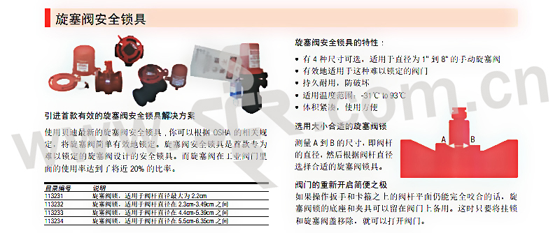 ·有4种尺寸可选,适用于直径为1"到 8"的手动旋塞阀 ·有效地适用于这种难以锁定的阀门 ·持久耐用,防破坏 ·适用温度范围: -31°C to 93°C ·体积紧凑,使用方便 ·符合安全标准:OSHA 29CFR1910。147危险能源的控制 ANSI Z244。1标准-危险能源的控制 选用大小合适的旋塞阀锁 测量A到B的尺寸,即阀杆的直径,然后根据阀杆直径选择合适的旋塞阀锁具。 阀门的重新开启简便之极 如果操作扳手和卡箍之上的阀杆平面仍能完全咬合的话,旋塞阀锁的底座和夹具可以留在阀门上备用。这时只要将挂锁和旋塞阀盖移除,就可以打开阀门。
