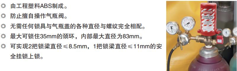·由工程塑料ABS制成。防止擅自操作气瓶阀。 ·无需任何锁具与气瓶盖的各种直径与螺纹完全相配。 ·最大可锁住35mm的颈环,内部最大直径为83mm。 ·可实现2把锁梁直径≤8.5mm,1把锁梁直径≤11mm的安全挂锁上锁。