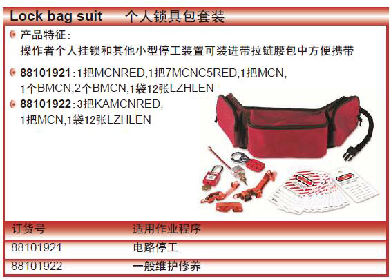·产品特征:操作者个人挂锁和其他小型停工装置可装进带拉链腰包中方便携带88101921:1把MCNRED,1把7MCNC5RED,1把MCN,1个BMCN,2个BMCN,1袋12张LZHLEN88101922:3把KAMCNRED,1把MCN,1袋12张LZHLEN