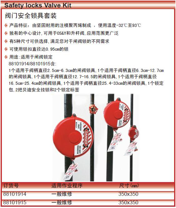 ·产品特征:由坚固耐用的注模聚丙烯制成 ,使用温度-32℃至93℃独有的中心设计,可用于OS&Y和升杆阀,应用范围更广泛有5种尺寸可供选择,满足您对于闸阀锁的不同需求可使用锁扣直径达0.95cm的锁 ·用途:适用于闸阀锁定 ·88101914/88101915含:1个适用于阀柄直径2.5cm-6.3cm的闸阀锁具,1个适用于阀柄直径6.3cm-12.7cm的闸阀锁具,1个适用于阀柄直径12.7-16.5的闸阀锁具,1个适用于阀柄直径 ·16.5cm-25.4cm的闸阀锁具,1个适用于阀柄直径25.4-33cm的闸阀锁具,1个锁定包,2把贝迪安全挂锁和2个锁定标签