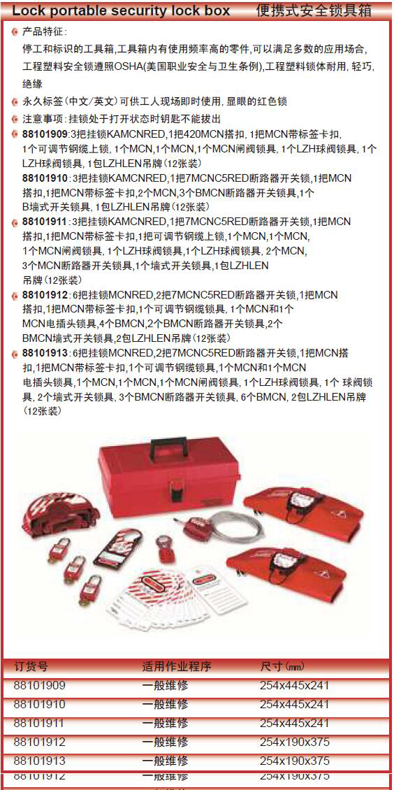 ·88101909:3把挂锁KAMCNRED,1把420MCN搭扣,1把MCN带标签卡扣,1个可调节钢缆上锁,1个MCN,1个MCN,1个MCN闸阀锁具,1个LZH球阀锁具,1个LZH球阀锁具,1包LZHLEN吊牌(12张装)