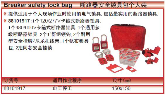 ·提供适用于个人现场作业时使用的电气锁具,包括最实用的断路器锁具. ·88101917:1个120/277V卡箍式断路器锁具,1个480/600V卡箍式断路器锁具,1个通用多级断路器锁具,2个1”群组锁钩,2个耐用型安全挂牌/尼龙扎线带,1个帆布锁具包,2把同芯安全挂锁