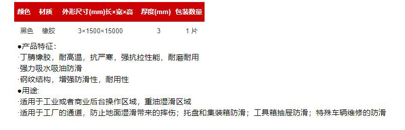 ·丁腈橡胶,耐高温,抗严寒,强抗拉性能,耐磨耐用 ·强力吸水吸油防滑 ·钢纹结构,增强防滑性,耐用性