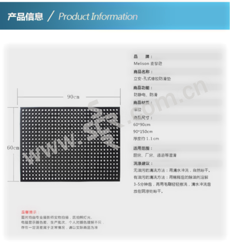 MELISON/麦黎逊 孔式防滑耐油疏水地垫 NYSS01-60 黑色 60×90cm 1件