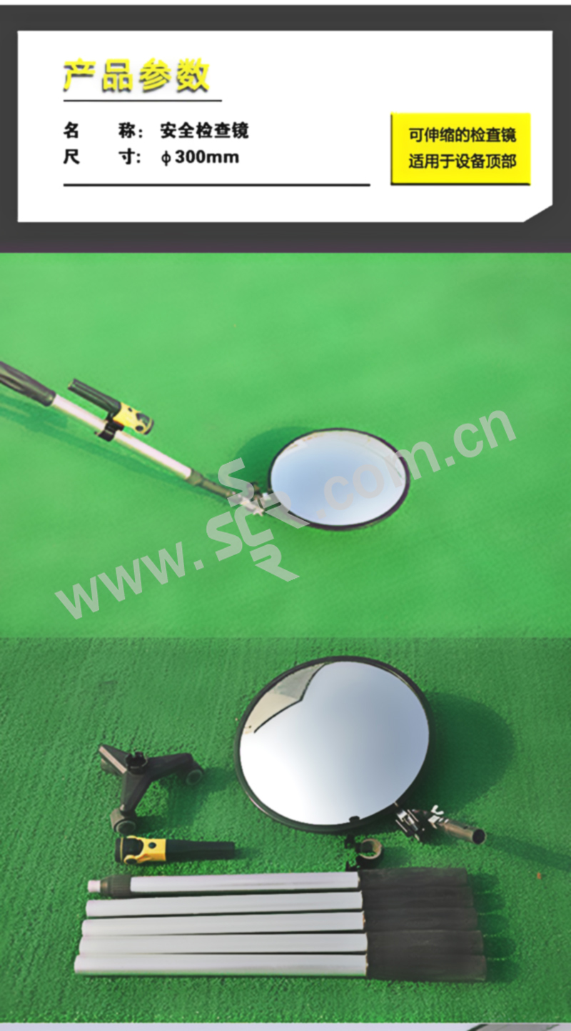 ·该产品用于观测视线无法触及的区域,如货车顶部、设备顶部等·伸缩杆伸缩范围为0.5-1m,配有四根加长连接杆可将长度拓展至3m·PC镜面耐冲击,不易破碎·伸缩杆上配备手电筒,提升夜间可视性·附送便携提包