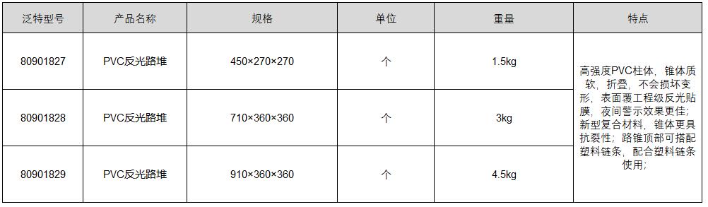 ·高强度PVC柱体,锥体质软,折叠,不会损坏变形,表面覆工程级反光贴膜,夜间警示效果更佳; ·新型复合材料,锥体更具抗裂性; ·路锥顶部可搭配塑料链条,配合塑料链条使用;