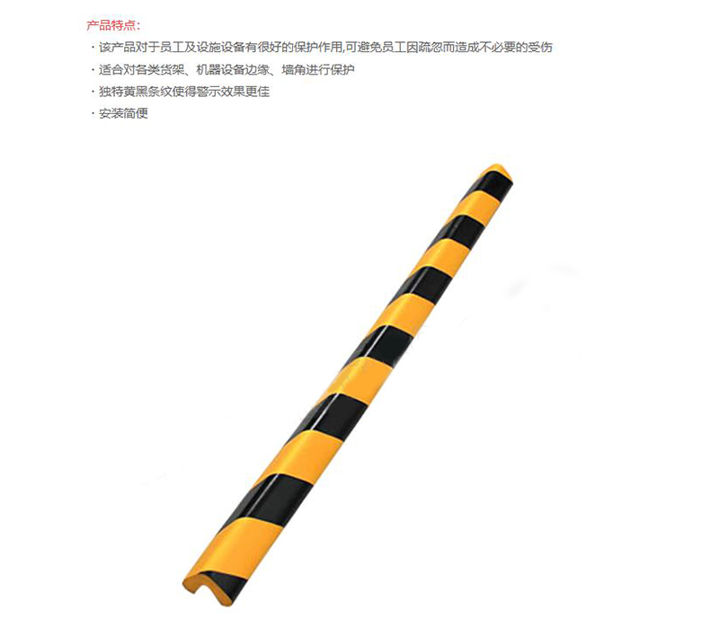 ·该产品对于员工及设施设备有很好的保护作用,可避免员工因疏忽而造成不必要的受伤 ·适合对各类货架、机器设备边缘、墙角进行保护 ·独特黄黑条纹使得警示效果更佳 ·安装简便