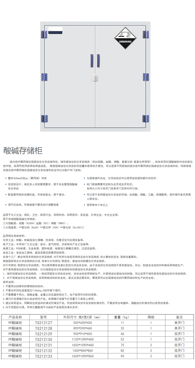 ·采用耐酸碱聚丙烯板材无缝焊接而成,具有十年以上的使用寿命。 ·配备聚丙烯防泄漏托盘,可单独取出,便于清洁。 ·可调节层板,耐腐蚀,弱酸强碱存储柜 ·为提高操作安全度,化学品柜还可以使用挂锁提供额外的防护。 ·醒目的腐蚀性化学品标志。 ·可以用于各种腐蚀性化学品的存储,如硫酸,硝酸,乙酸,硫磺酸等,保护操作者及周围人群安全。