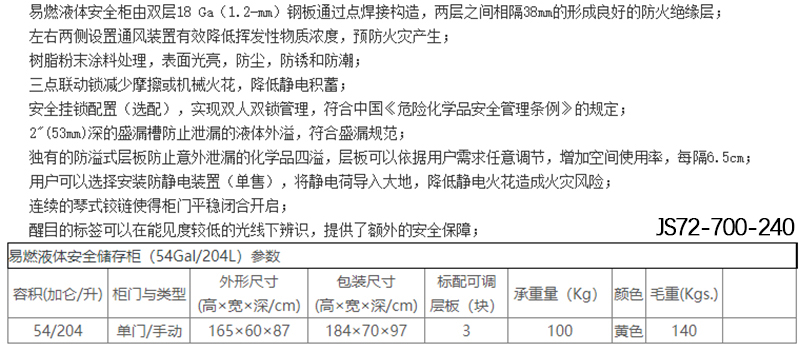 规格:  54加仑/204L 制造商型号:  JS72-700-240
