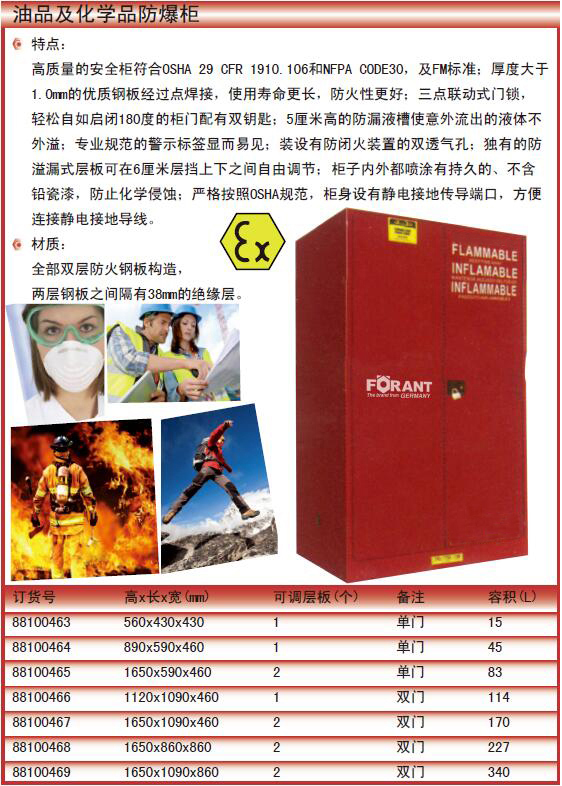 ·柜体内部配备防泄漏的个层板,可以在60cm间距自由上下调节高度,有效地利用空间来存放装有各类可燃性化学品物质的安全罐;柜体底部有50mm高度的防泄漏槽,防止可燃性液体化学品的溢出。
