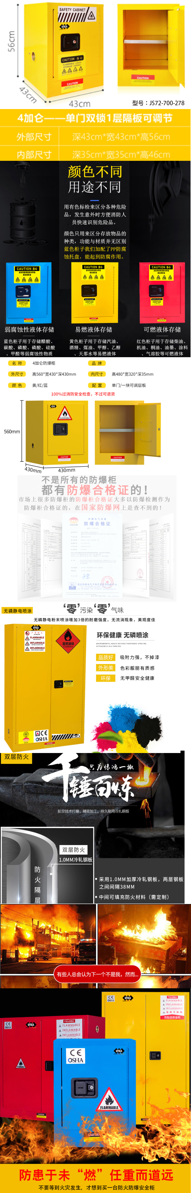 ·左右两侧设置通风装置有效降低挥发性物质浓度,预防火灾产生;树脂粉末涂料处理,表面光亮,防尘,防锈和防潮; ·三点联动锁减少摩擦或机械火花,降低静电积蓄; ·安全挂锁配置〈选配〉,实现双人双锁管理,符合中国《危险化学品安全管理条例》的规定;