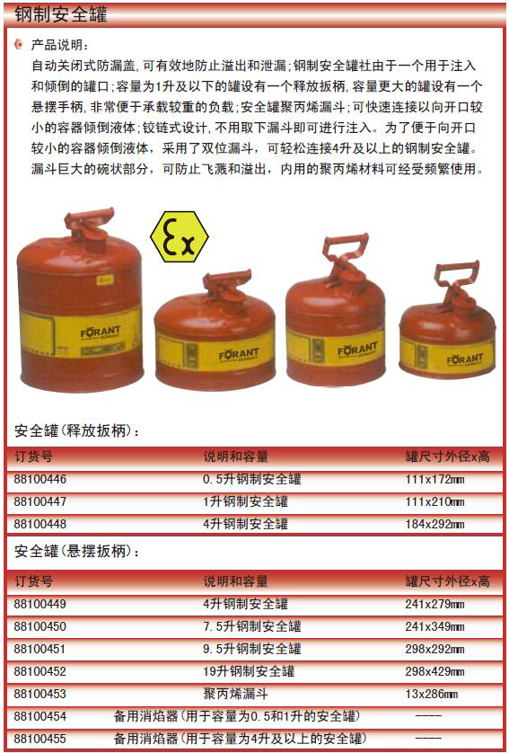·产品说明: ·自动关闭式防漏盖,可有效地防止溢出和泄漏;钢制安全罐社由于一个用于注入和倾倒的罐口; ·容量为1升及以下的罐设有一个释放扳柄,容量更大的罐设有一个悬摆手柄,非常便于承载较重的负载;安全罐聚丙烯漏斗; ·可快速连接以向开口较小的容器倾倒体;铰链式设计,不用取下漏斗即可进行注入。 ·为了便于向开口较小的容器倾倒液体,采用了双位漏斗,可轻松连接4升及以上的钢制安全罐。 ·漏斗巨大的碗状部分,可防止飞溅和溢出,内用的聚丙烯材料可经受频繁使用。