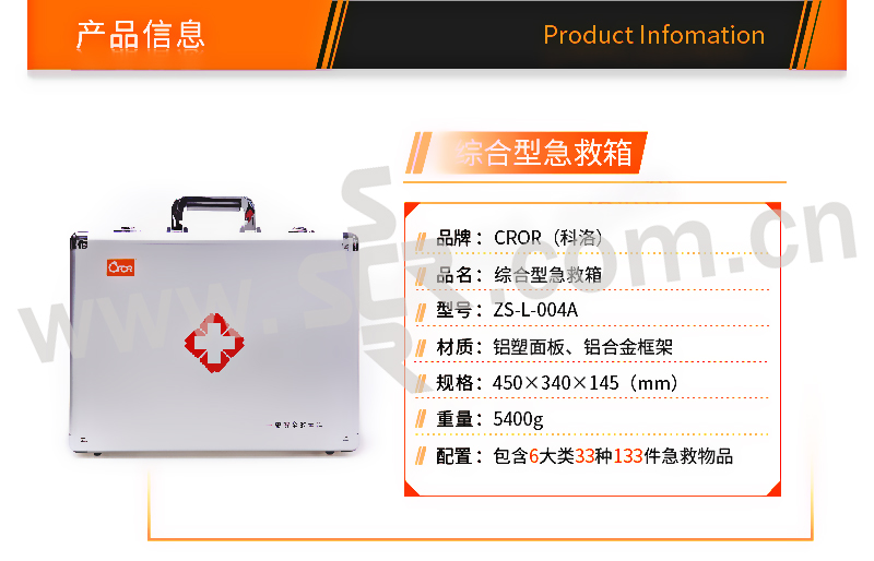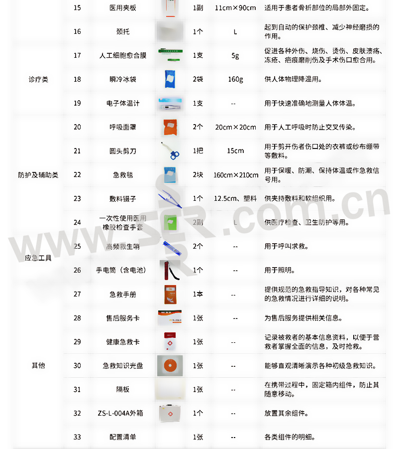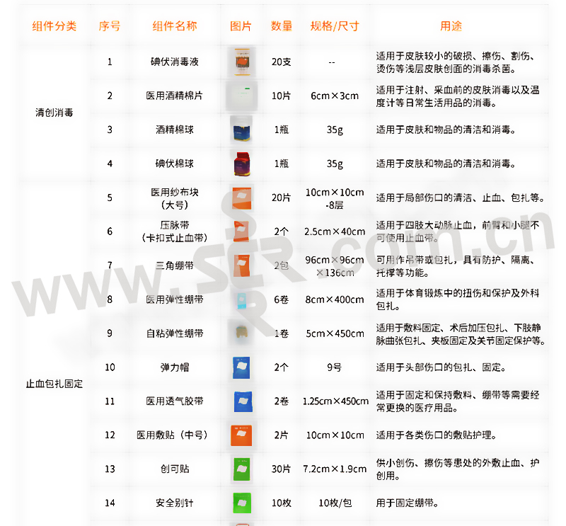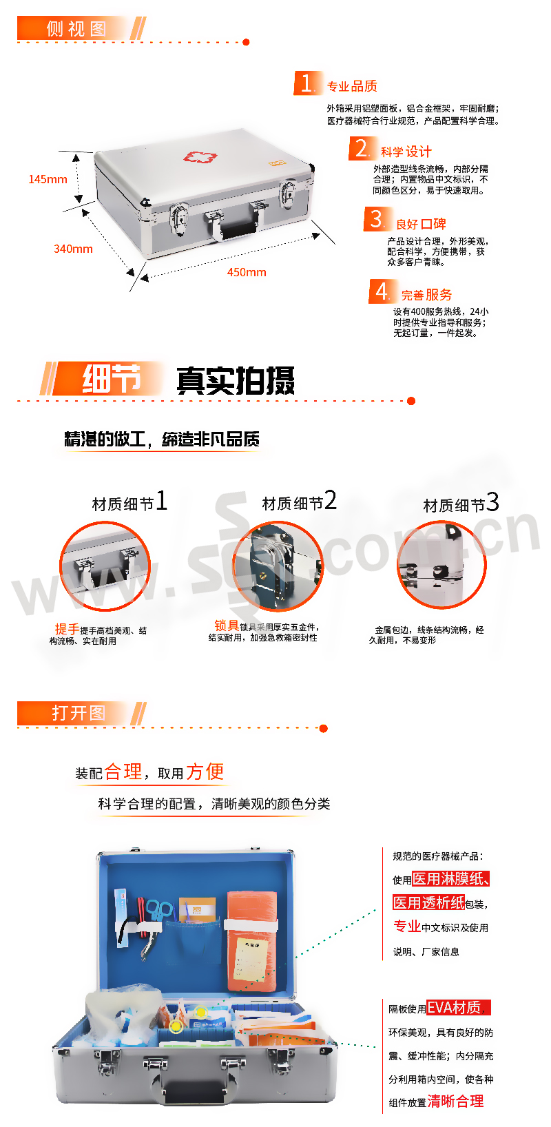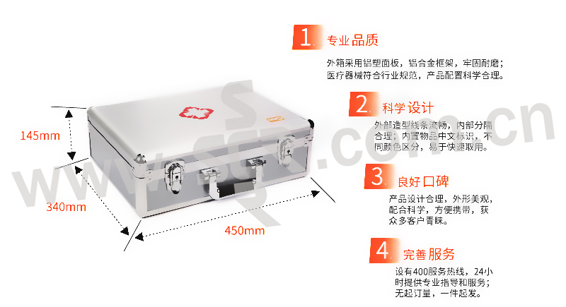 ·侧重于院前急救所需的医疗器械产品。 ·解决人体伤害发生及时进行清创消毒、止血包扎、肢体固定、移送观察,创伤愈合等护理需求。·规格尺寸:450mm×340mm×145mm·外观颜色:银白色·适用人数:10—20人