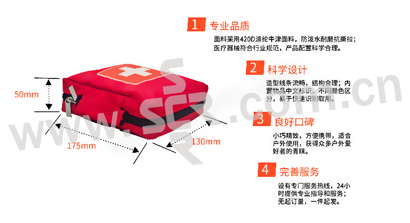 · 红色的外观设计使急救包更加显眼,贴合户外工作和户外运动的特性。