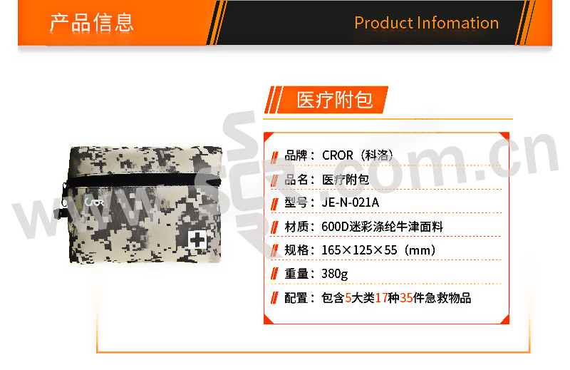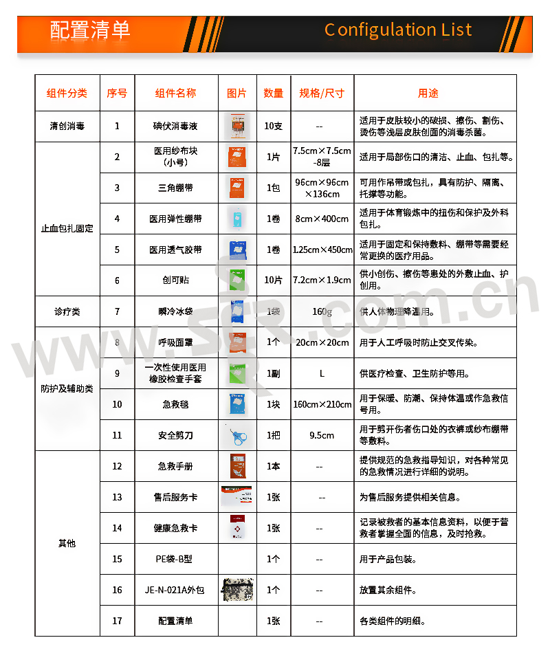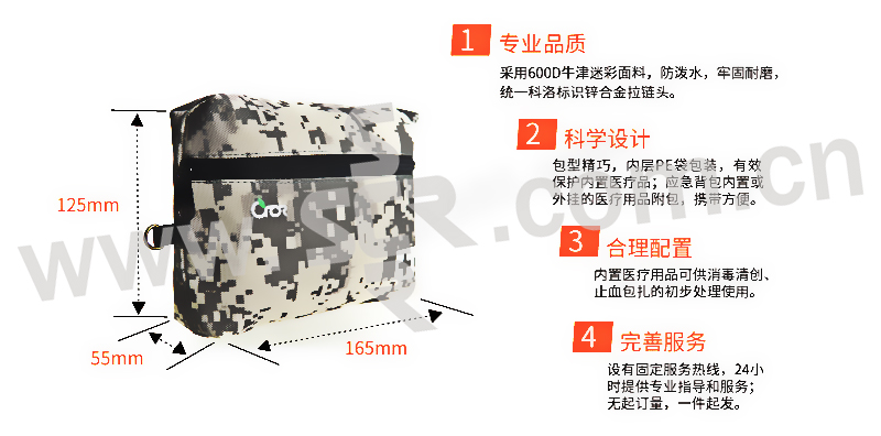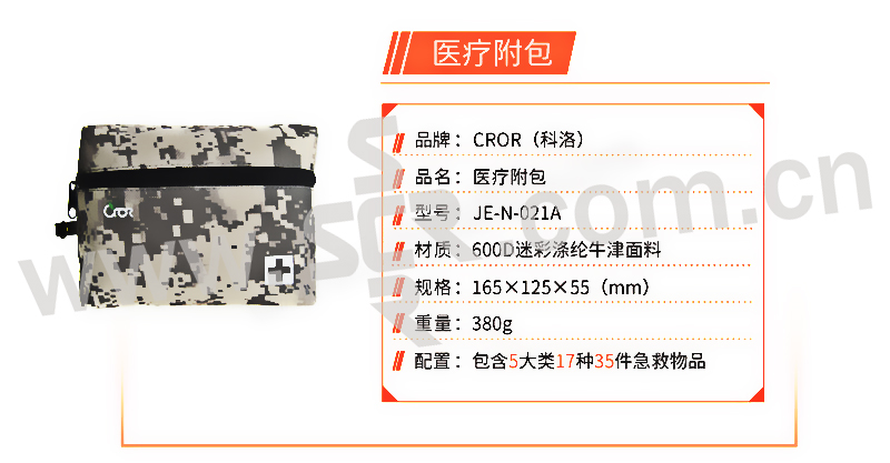 ·内置医疗用品可供消毒清创、止血包扎的初步处理,能满足日常生活中常见的伤害处理。