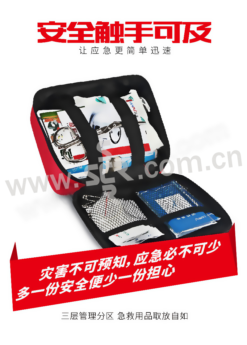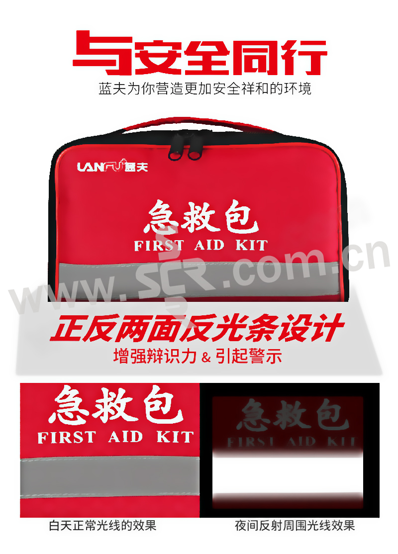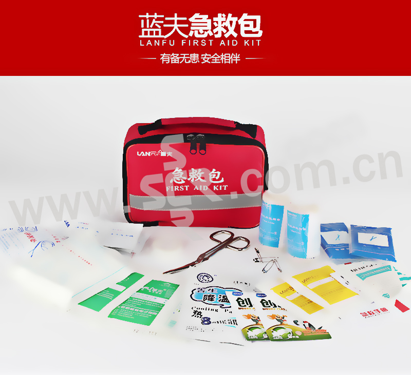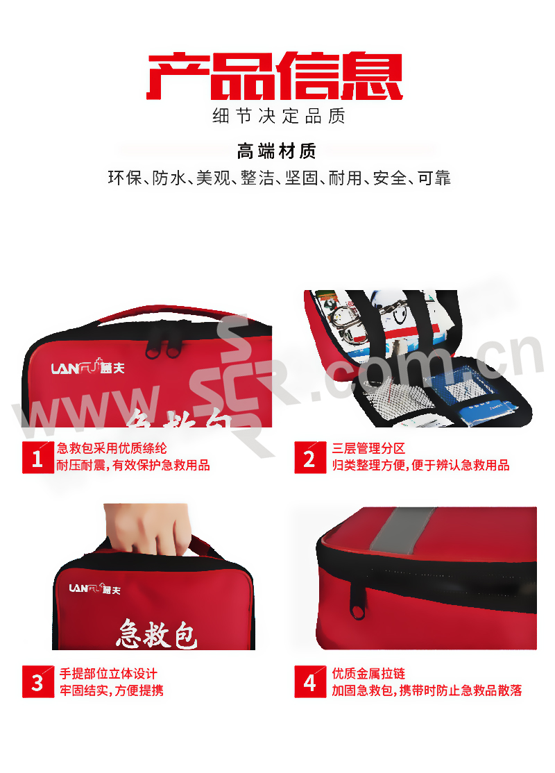 ·采用牛津布制作,主要有消毒清创、伤口包扎、防护隔离、降温冷敷等功能及其它器具