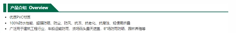 ·优质PVC材质 ·100%防水性能,超强防晒、防尘、防风、抗冻、抗老化、抗腐蚀、轻便易折叠 ·广泛用于建筑工程行业,车船运输防雨,货场码头露天遮盖,矿场防雨防晒,园林养殖等