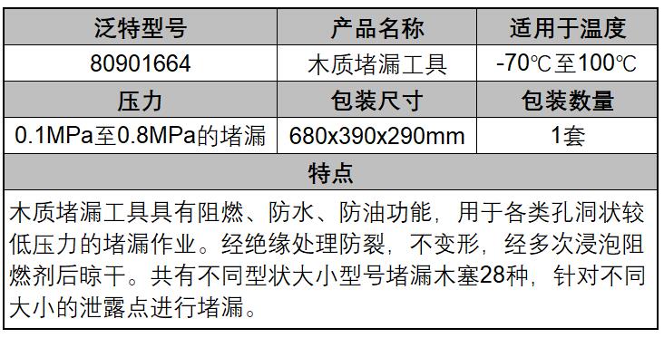 ·木质堵漏工具具有阻燃、防水、防油功能,用于各类孔洞状较低压力的堵漏作业。 ·经绝缘处理防裂,不变形,经多次浸泡阻燃剂后晾干。 ·共有不同型状大小型号堵漏木塞28种,针对不同大小的泄露点进行堵漏。