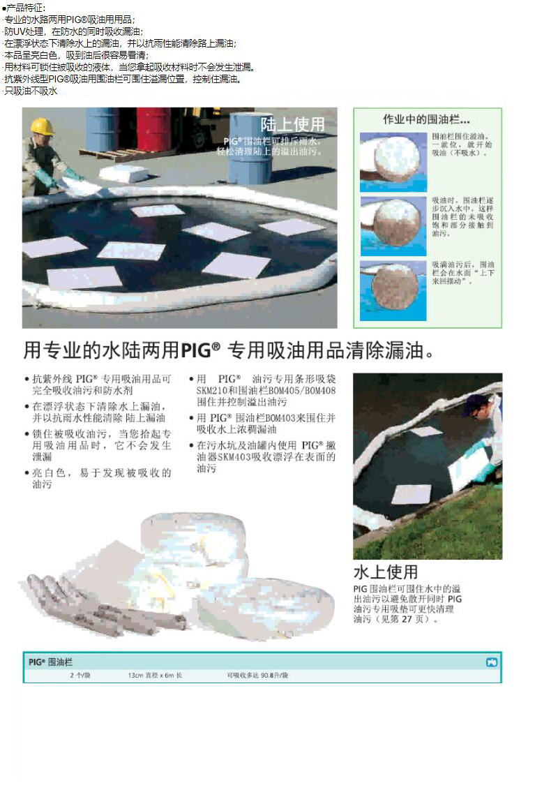 ·专业的水路两用PIG®吸油用用品; ·防UV处理,在防水的同时吸收漏油; ·在漂浮状态下清除水上的漏油,并以抗雨性能清除路上漏油; ·本品呈亮白色,吸到油后很容易看清; ·用材料可锁住被吸收的液体,当您拿起吸收材料时不会发生泄漏。 ·抗紫外线型PIG®吸油用围油栏可围住溢漏位置,控制住漏油。 ·只吸油不吸水