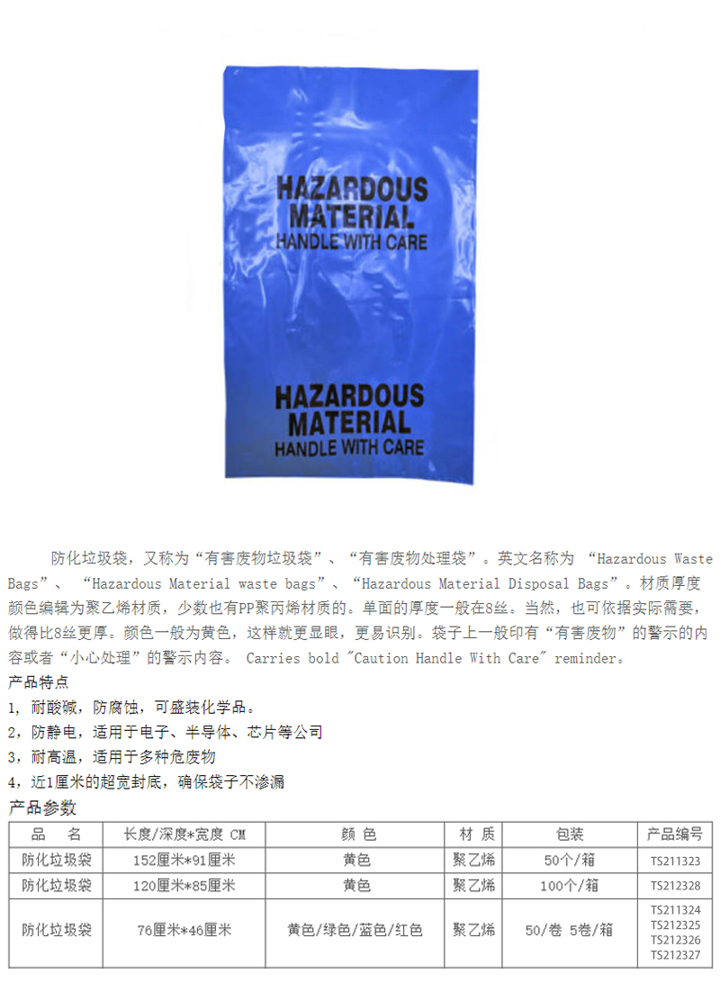 ·坚韧的聚乙烯材质的袋子耐穿刺、耐撕裂并防止渗漏 ·安全用于有害废物或污染废物的处理 ·持久耐用 ·聚乙烯材质可耐腐蚀、防化、耐强酸碱