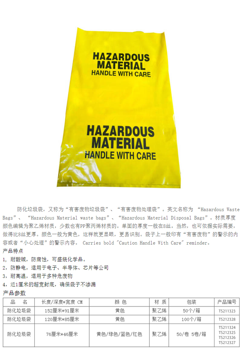 ·坚韧的聚乙烯材质的袋子耐穿刺、耐撕裂并防止渗漏 ·安全用于有害废物或污染废物的处理 ·持久耐用 ·聚乙烯材质可耐腐蚀、防化、耐强酸碱