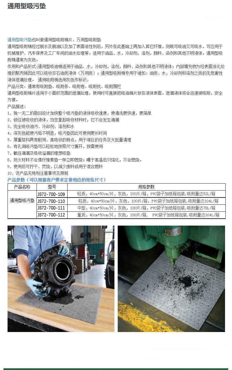 ·独一无二的微凹设计加快整个吸污垫的液体吸收速度,使清洗更快速,更简单 ·锁住被吸收的液体,当您拿起吸收材料时,它不会发生滴漏 ·完全吸收油污、冷却剂、溶剂和水 ·深灰色能使污垢不明显,吸污垫因此可使用更长时间 ·厚重结构具有耐用、高吸收的特点,用于艰巨的任务及大批量清理 ·有孔洞吸污垫可以轻松地按照尺寸撕开,按需使用 ·截住滴漏及吸收溢漏的理想吸垫 ·防火材料不会像纤维素垫一样立即燃烧;曝于高温后只熔化,不会燃烧。 ·使用后可拧干、焚烧,以减少废料或用于混合燃料 ·该产品无特别注意事项及限制