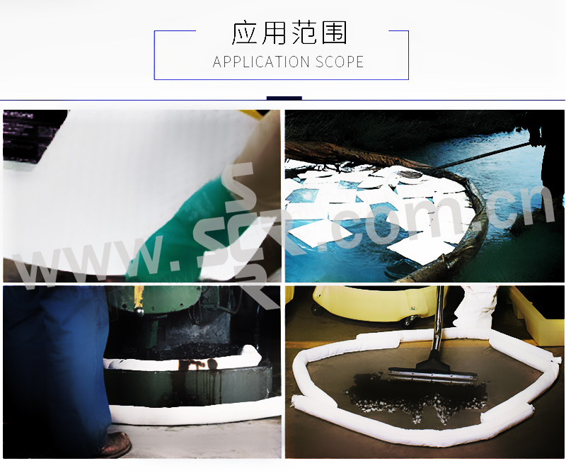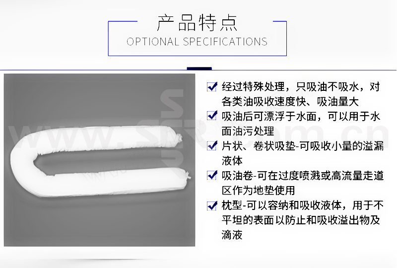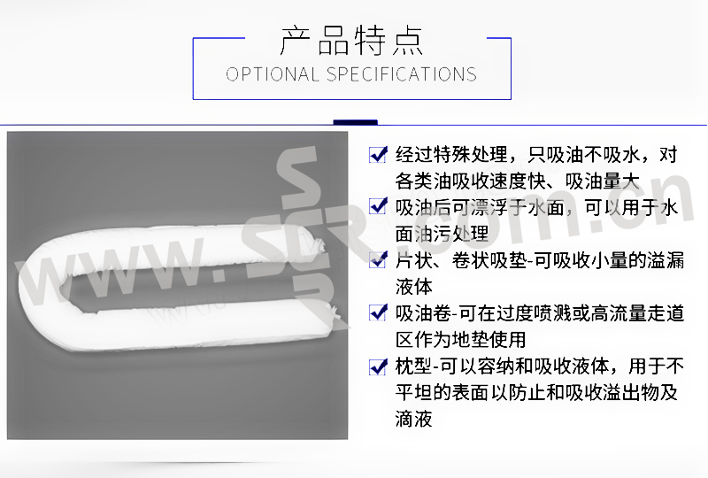 ·经过特殊拒水处理,只吸油不吸水,对各类油吸收速度快。吸油量大·吸油后可漂浮于水面,可以用于水面油污处理·片状、卷装吸垫可吸收小量的溢漏液体·卷状可在过度喷溅或高流量走道区作为地垫使用,具有耐磨性能的上层可将水分吸收到下层中去,防止走道湿滑及有害液体污染,保持工作场地清洁、安全·有分割虚线,取用方便·枕形可容纳和吸收液体,用于不平坦的表面以防止和吸收溢出物及液滴·条形可用做围栏,吸收并防止油污扩散·适用于水面浮油处理·带白色耐磨网套,有绳索钩环
