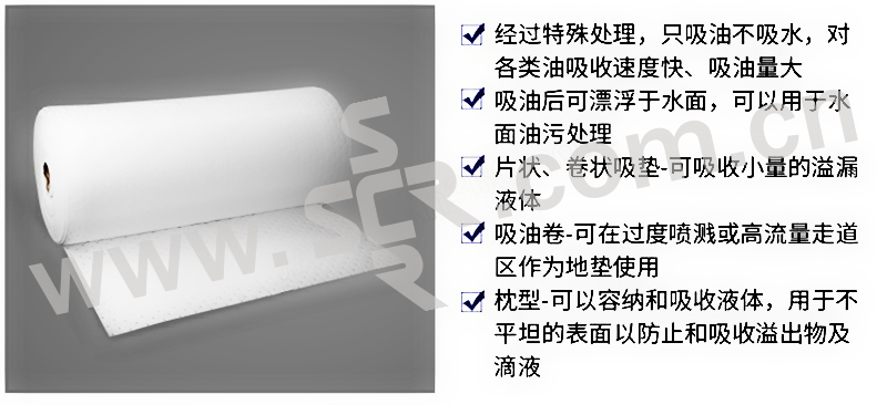 ·经过特殊拒水处理,只吸油不吸水,对各类油吸收速度快。吸油量大·吸油后可漂浮于水面,可以用于水面油污处理·片状、卷装吸垫可吸收小量的溢漏液体·卷状可在过度喷溅或高流量走道区作为地垫使用,具有耐磨性能的上层可将水分吸收到下层中去,防止走道湿滑及有害液体污染,保持工作场地清洁、安全·有分割虚线,取用方便·枕形可容纳和吸收液体,用于不平坦的表面以防止和吸收溢出物及液滴·条形可用做围栏,吸收并防止油污扩散·适用于水面浮油处理