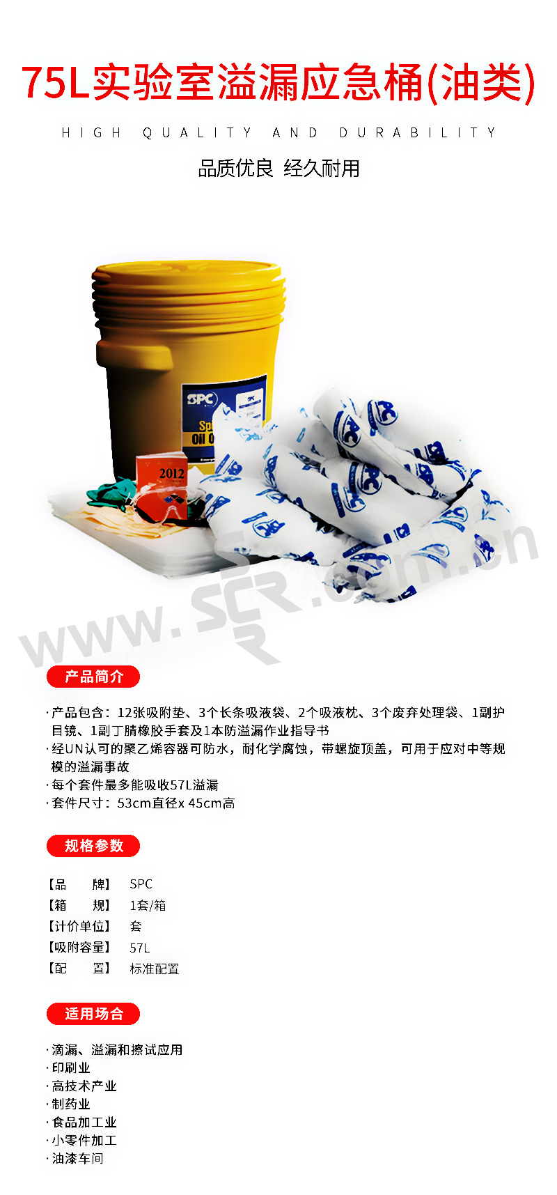 ·产品包含:12张吸附垫、3个长条吸液袋、2个吸液枕、3个废弃处理袋、1副护目镜、1副丁腈橡胶手套及1本防溢漏作业指导书·经UN认可的聚乙烯容器可防水,耐化学腐蚀,带螺旋顶盖,可用于应对中等规模的溢漏事故·每个套件最多能吸收57L溢漏·套件尺寸:53cm直径x 45cm高