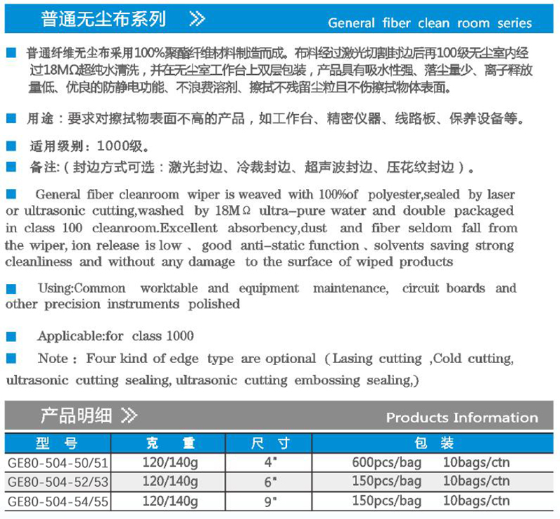 ·普通纤维无尘布采用100%聚瞠T维材料制造而成。布料经过激光切割街边后再100级无尘室内经过18MQ超纯水清洗,并在无尘室工作台上双层包装,产品具有吸水性强、落尘量少、离子释放量低、优良的防静电功能、不浪费溶剂、擦拭不残留尘粒且不伤擦拭物体表面。