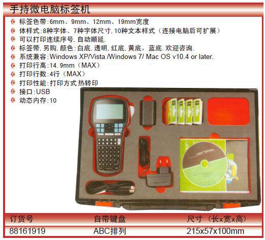 ·标签色带:6mm、9mm、12mm、19mm宽度体样式:8种字体、7种字体尺寸,10种文本样式(连接电脑后可扩展)可以打印连续序号,自动顺延.标签带,另购,颜色:白底,透明,红底,黄底,蓝底.欢迎咨询.系统兼容:Windows XP/VistaWindows 7/ Mac OS v10.4 or later.打印行高:14.9mm(MAX)打印行数:4行(MAX)打印性能:打印方式 热转印 ·接口:USB ·动态内存:10