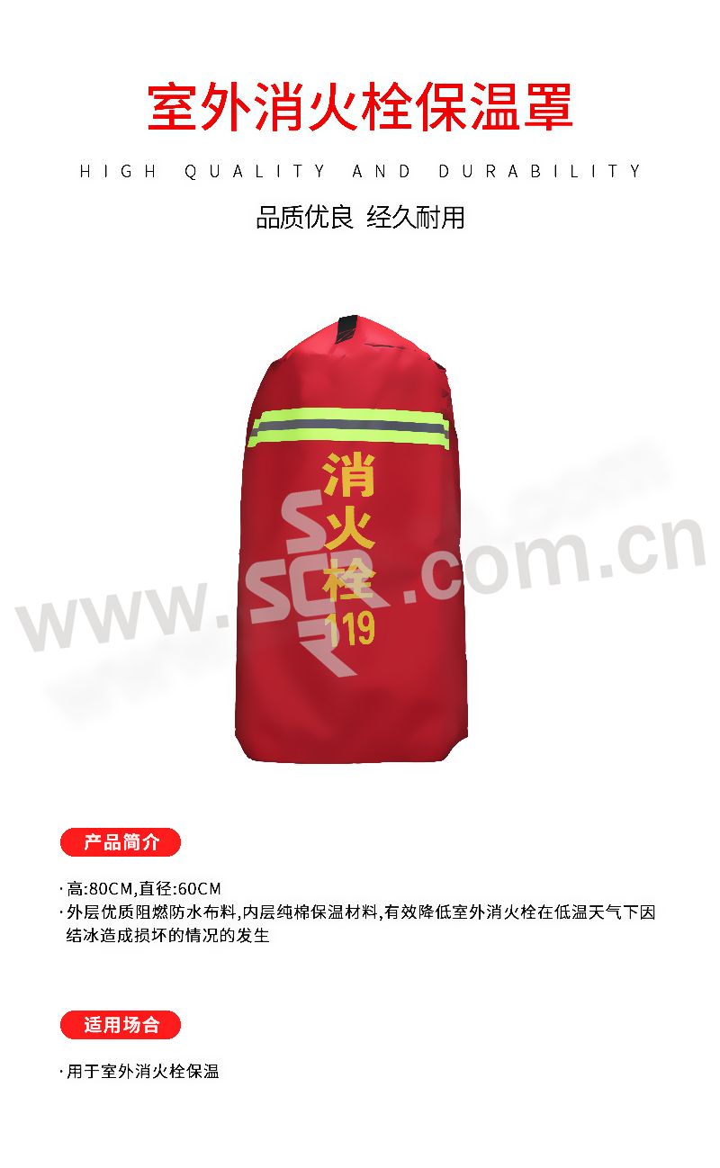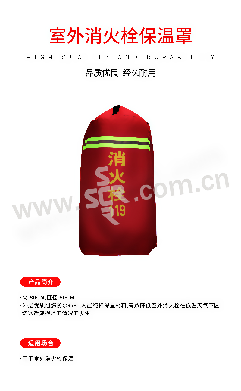 ·外层优质阻燃防水布料,内层纯棉保温材料,有效降低室外消火栓在低温天气下因结冰造成损坏的情况的发生