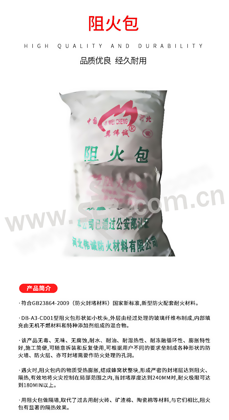 ·该产品无毒、无味、无腐蚀,耐水、耐油、耐湿热性、耐冻融循环性、膨胀特性好,施工简便,可随意拆装和反复使用,可根据用户不同的要求垒制成各种形状的防火墙、防火层、亦可封堵需要作防火处理的孔洞。