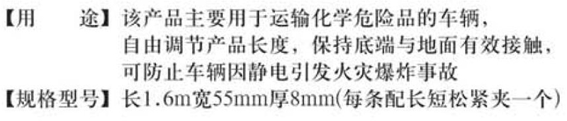 ·该产品主要用于运输化学危险品的车辆,自由调解产品长度,保持低端与地面的有效接触,可防车辆因静电引发火灾爆炸事故。