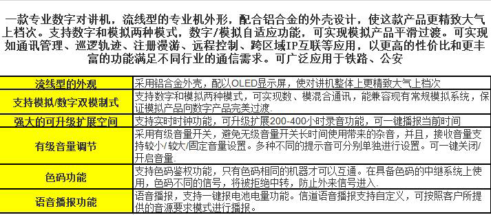 ·OLED显示屏;直通双时隙技术;虚拟集群(选配);高精度GPS/BD定位(选配);注册,漫游,倒放等高端功能(选配);录音功能(选配)专业的外观设计配合OLED显示屏;直通双时隙,容纳更多组别通讯;支持注册,漫游,GPS定位,倒放报警,虚拟集群等高端应用功能;模拟+数字双模制式,支持自适应数/模混合通讯;支持对讲机检测,摇毙(解码),摇晕(解码)激活(解码)单远程监听(解码)和单独工作等远程调度管理功能;语音加密及色码鉴定功能;支持多模式联动报警,支持倒放报警(倒放报警需定制);采用有级音量开关,支持较