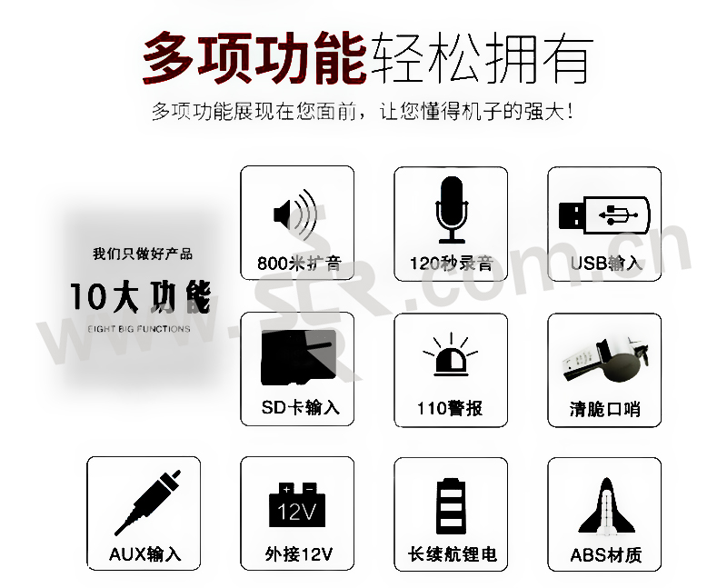 ·具有扩音、录音、警报、汽车喇叭声、U盘插入、SD卡、AUS插口,使用方便