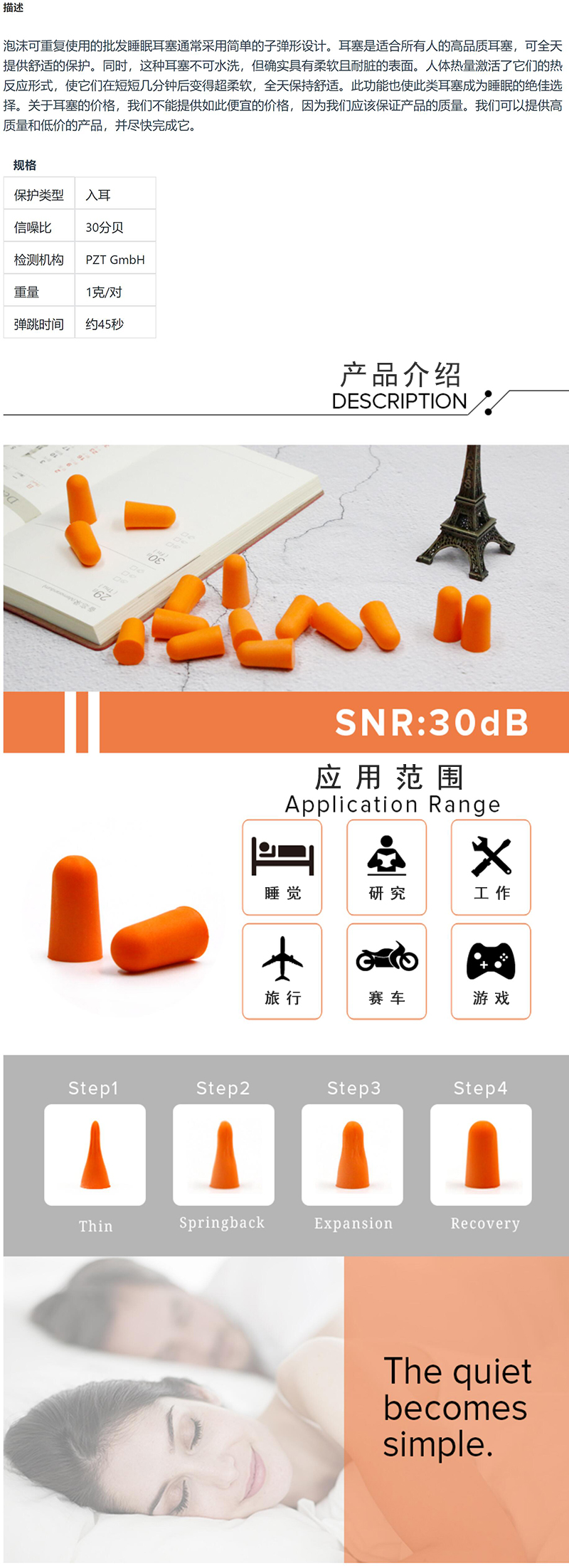 ·泡沫可重复使用的批发睡眠耳塞通常采用简单的子弹形设计。耳塞是适合所有人的高品质耳塞,可全天提供舒适的保护。同时,这种耳塞不可水洗,但确实具有柔软且耐脏的表面。人体热量激活了它们的热反应形式,使它们在短短几分钟后变得超柔软,全天保持舒适。此功能也使此类耳塞成为睡眠的绝佳选择。