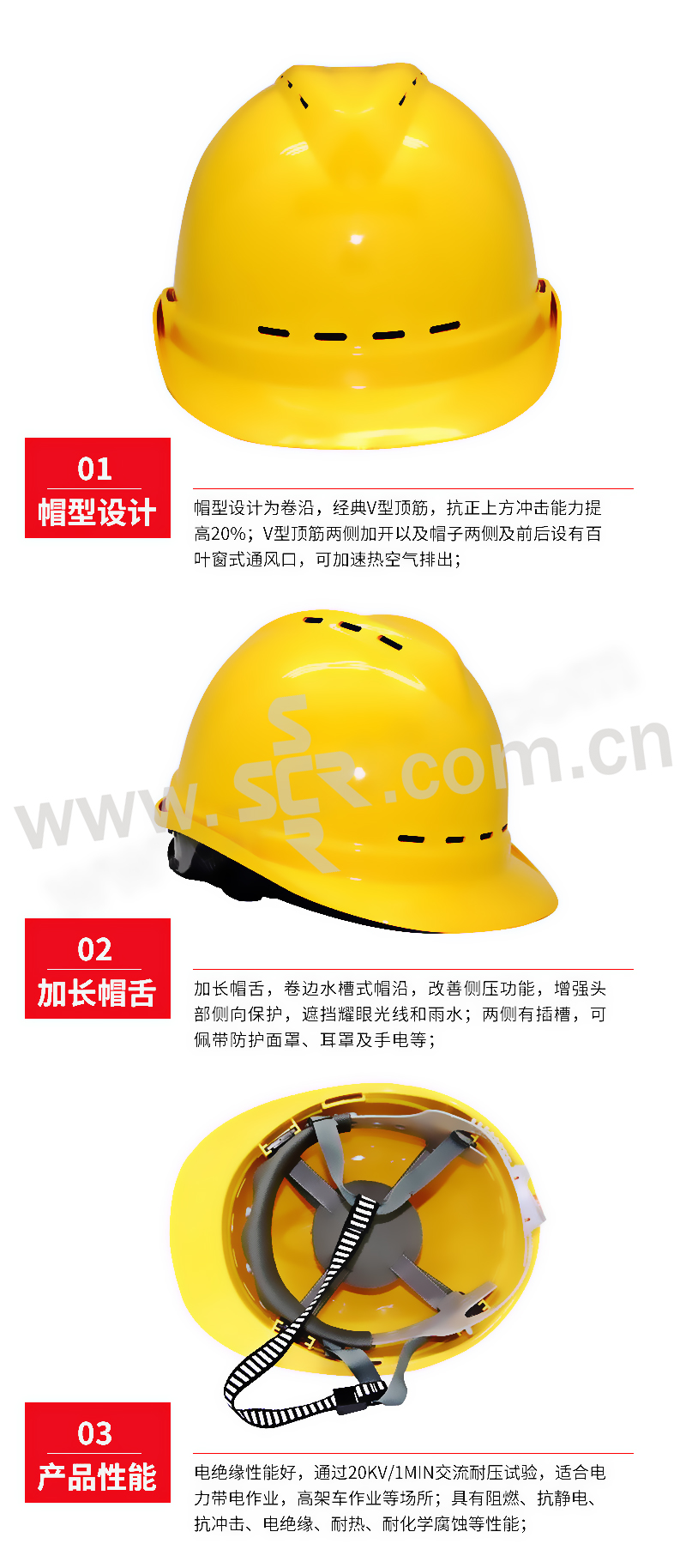 ·帽壳采用进口ABS工程塑料;帽型设计为卷沿,经典V型顶筋,抗正上方冲击能力提高20%;V型顶筋两侧加开以及帽子两侧及前后设有百叶窗式通风口,可加速热空气排出。两侧有向上凹陷的圆弧耳部轮廓线,便于佩带听力保护装置;加长帽舌,卷边水槽式帽沿,改善侧压功能,增强头部侧向保护,遮挡耀眼光线和雨水;两侧有插槽,可佩带防护面罩、耳罩及手电等;