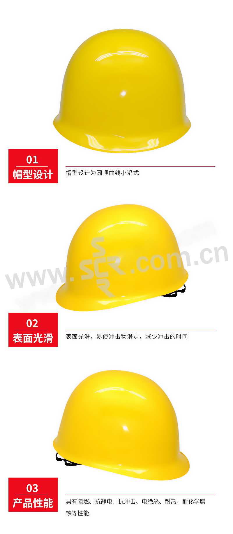 ·帽壳采用进口ABS工程塑料;帽型设计为卷沿,经典V型顶筋,抗正上方冲击能力提高20%;V型顶筋两侧加开以及帽子两侧及前后设有百叶窗式通风口,可加速热空气排出。两侧有向上凹陷的圆弧耳部轮廓线,便于佩带听力保护装置;加长帽舌,卷边水槽式帽沿,改善侧压功能,增强头部侧向保护,遮挡耀眼光线和雨水;两侧有插槽,可佩带防护面罩、耳罩及手电等;