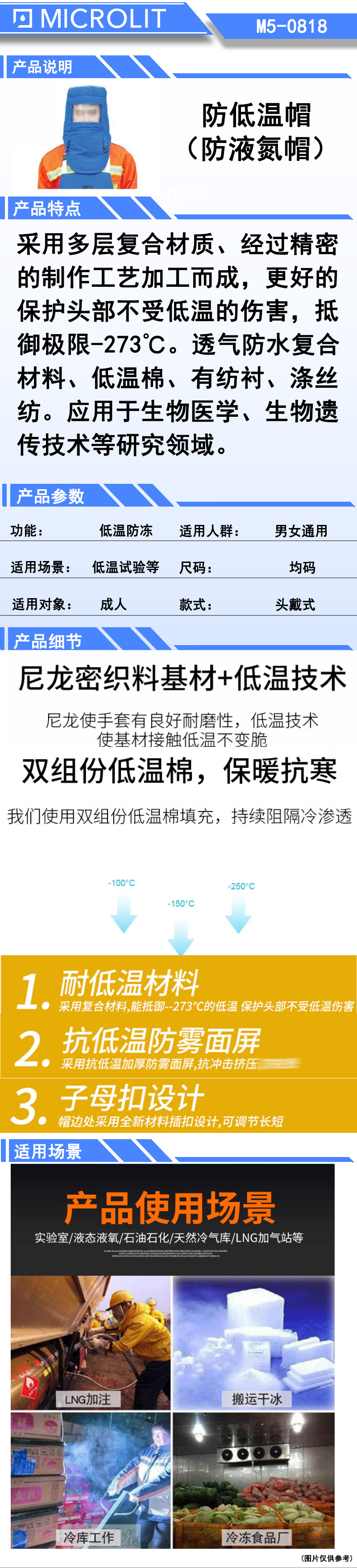 采用多层复合材质、经过精密的制作工艺加工而成,更好的保护头部不受低温的伤害,抵御极限-273°C