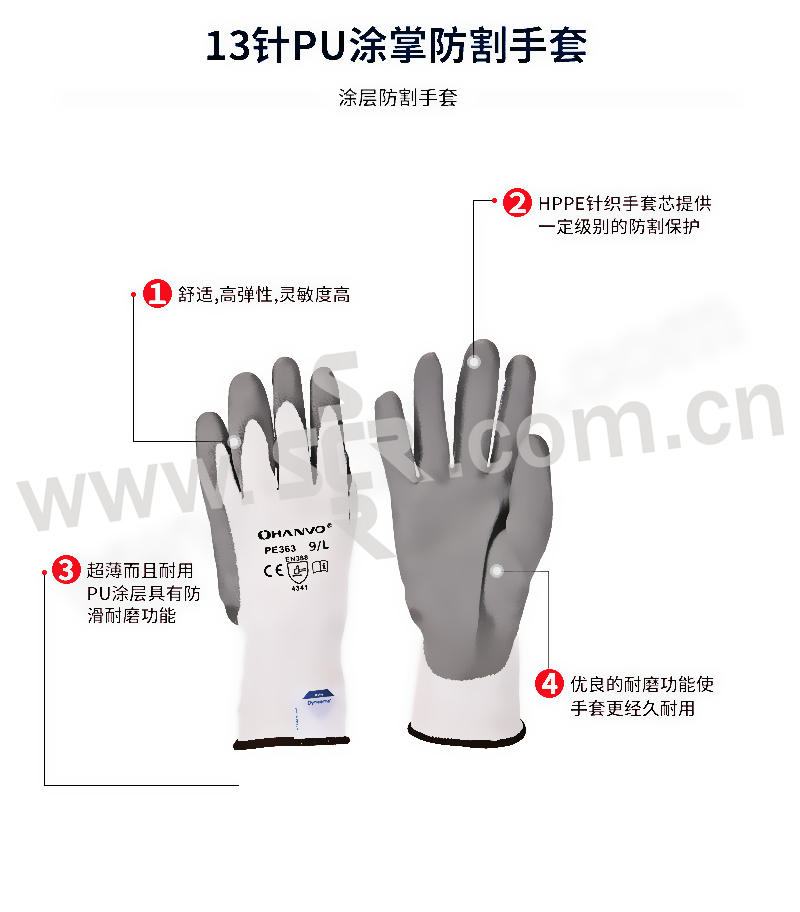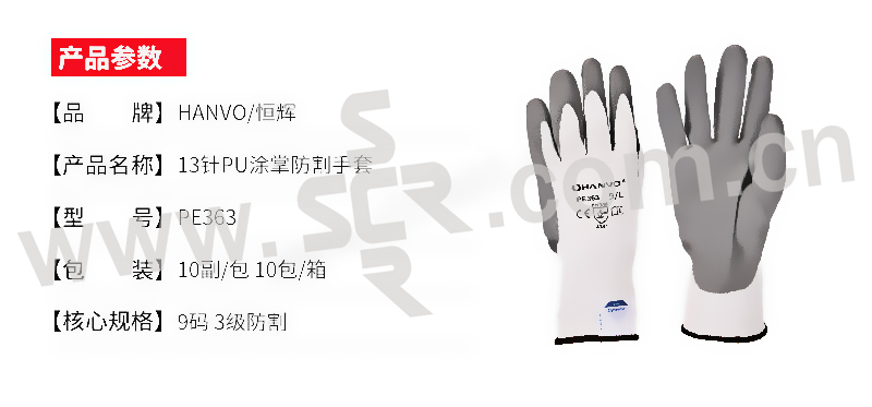 HANVO/恒辉 13针PU涂掌防割手套 PE363 9码 3级防割 1包
