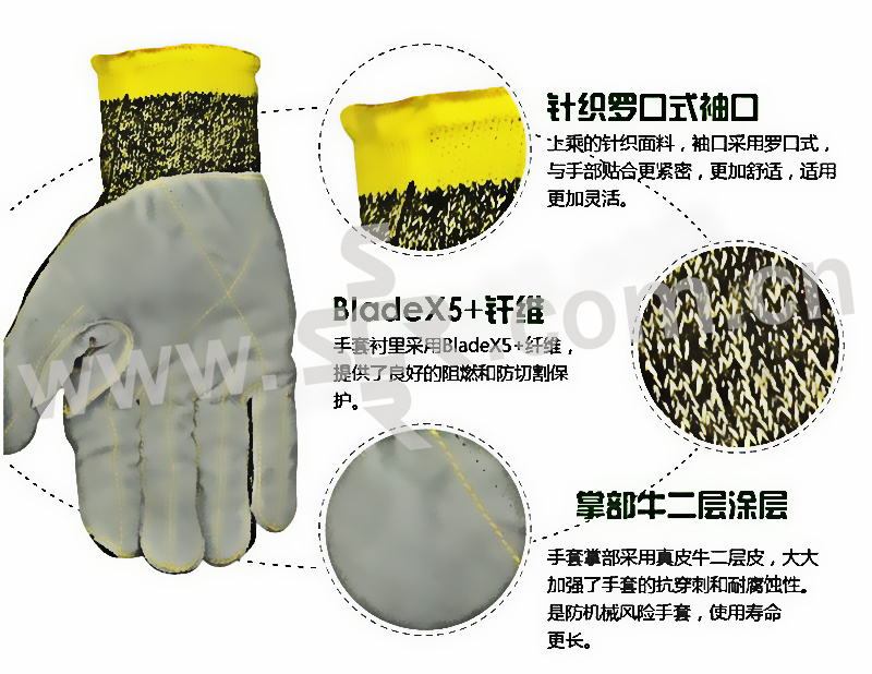 ·5级防割·10针,掌面贴牛二层皮,防穿刺和耐腐蚀 ·提供出色的防穿刺和防高温效果· Hybrid ArmorgardTM Akore纤维手套背面无涂层,透气舒适,同时提供理想的阻燃和防切割保护·可清洗,使用寿命更长