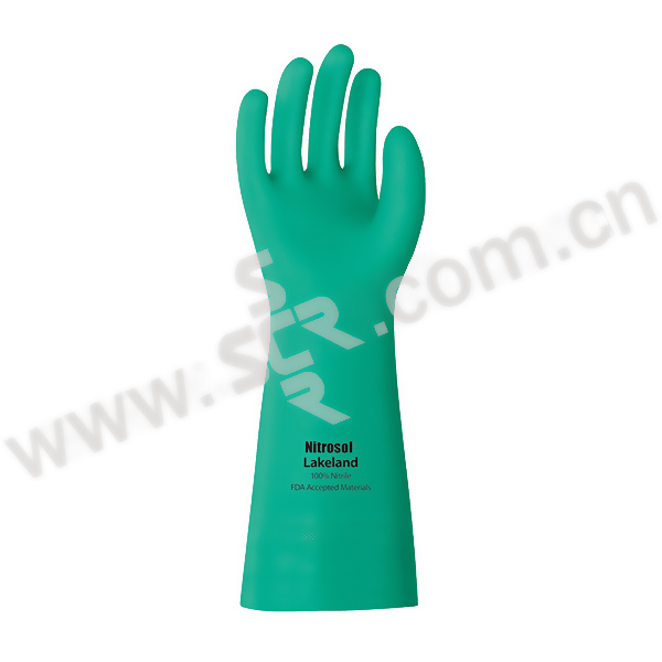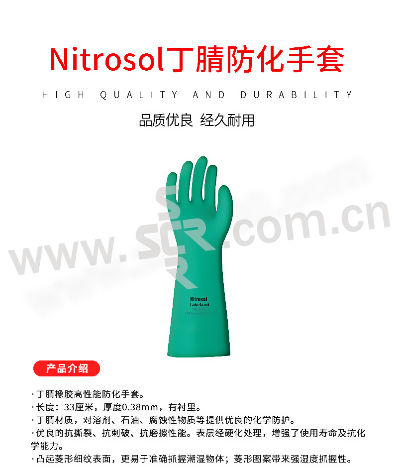 ·丁腈橡胶高性能防化手套·长度:33厘米,厚度0.38mm,有衬里·丁腈材质,对溶剂、石油、腐蚀性物质等提供优良的化学防护·优良的抗撕裂、抗刺破、抗磨擦性能。表层经硬化处理,增强了使用寿命及抗化学能力·凸起菱形细纹表面,更易于准确抓握潮湿物体。菱形图案带来强湿度抓握性