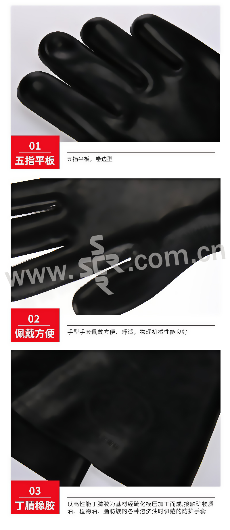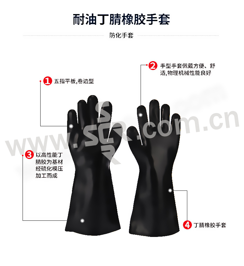·以高性能丁腈胶为基材经硫化模压加工而成,接触矿物质油、植物油、脂肪族的各种溶济油时佩戴的防护手套