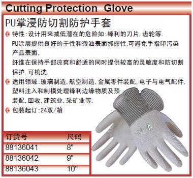 ·特性:设计用来减低潜在的危险如:锋利的刀片,齿轮等.PU涂层提供良好的干性和微油表面抓握性,可避免手指印污染产品表面. ·纤维在保持手部凉爽和舒适的同时提供较高的灵敏度和防切割保护.可机洗. ·适用领域:玻璃制造,航空制造,金属零件装配,电子与电气配件,塑料注入和制模处理锋利边缘物质及预装配,回收,建筑业,采矿业等. ·包装起订:24双/箱