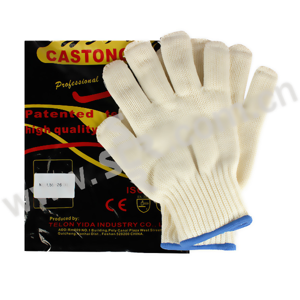 ·主要面料为间位芳纶(Meta Aramid)弹性针织布,耐温300℃,持续时间15-20秒,防割且耐磨,手型舒适灵活