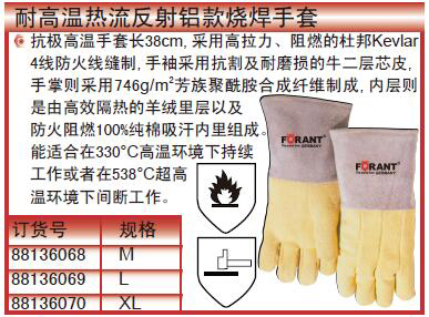 ·抗极高温手套长38cm·采用高拉力、阻燃的杜邦Kevlar4线防火线缝制·手袖采用抗割及耐磨损的牛二层芯皮手掌则采用746g/m2芳族聚酰胺合成纤维制成内层则是由高效隔热的羊绒里层以及防火阻燃100%纯棉吸汗内里组成。 ·能适合在330°C高温环境下持续工作或者在538°C超高温环境下间断工作。