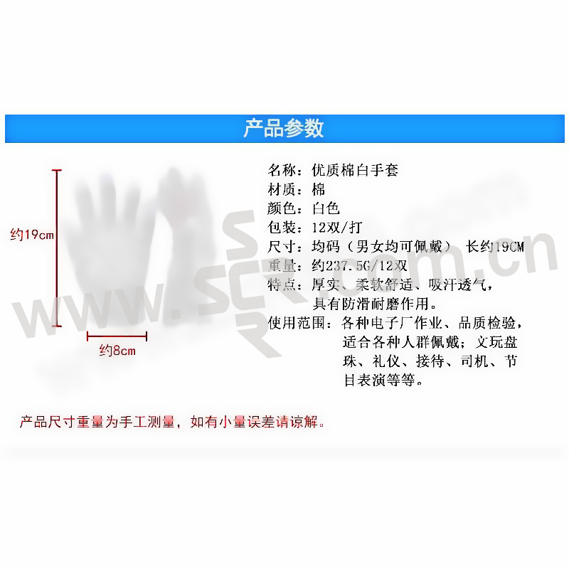 HT/华特 细小罗纹纯棉白手套 长19cm 均码 约20g 1双