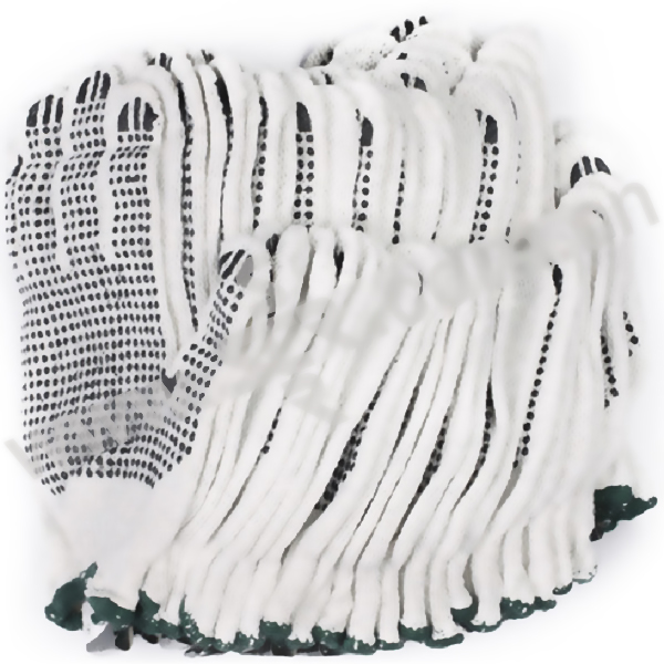 ·点塑手套棉纱,7针,掌心有黑色防滑点塑,不易漏针,不易破损,有良好的防护作用,透气性好。