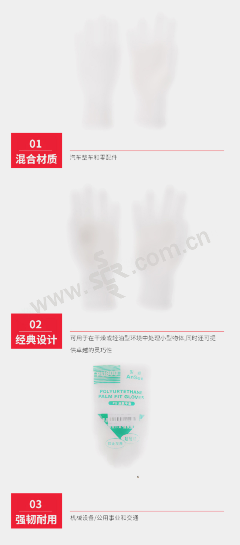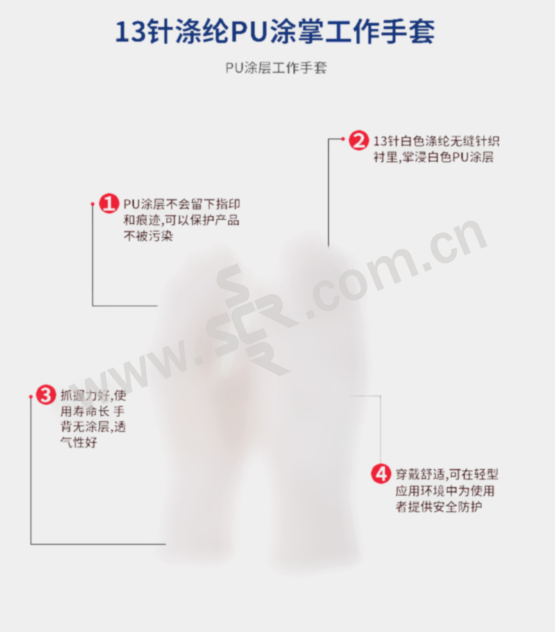 ·13针白色涤纶无缝针织衬里,掌浸白色PU涂层·PU涂层不会留下指印和痕迹,可以保护产品不被污染·抓握力好,使用寿命长 手背无涂层,透气性好·穿戴舒适,可在轻型应用环境中为使用者提供安全防护·可用于在干燥或轻油型环境中处理小型物体,同时还可提供卓越的灵巧性